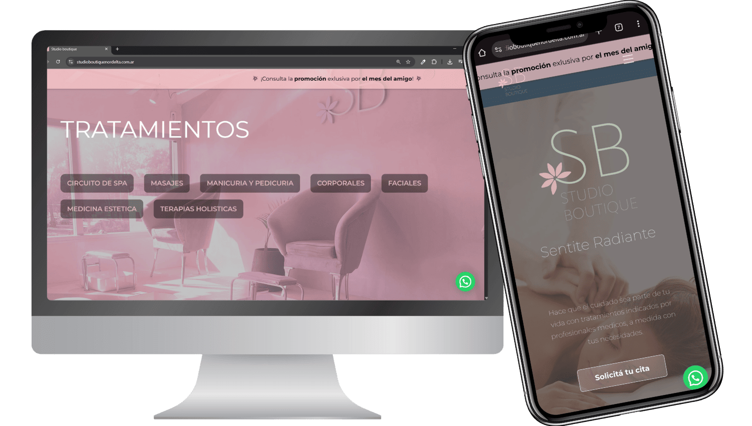 diseño respetado como en las instrucciones de la marca (Proporcionaron el diseño a seguir por su propio diseñador el cual fue desarrollado tal cual al 100%) con la integración del sistema de turnos que la misma marca usa, el cual es Agenda Pro implementado en la web mediante código puro. Cuenta además con diseño responsive y las secciones típicas de “sobre nosotros”, “Contacto”, sección de “Tratamientos” e integración a redes sociales y whatsapp. Ademas cuenta con una sección de testimonios reales de reseñas de google, implementación de banner promocional mensual y diseño moderno y dinámico que da profesionalidad a la web.